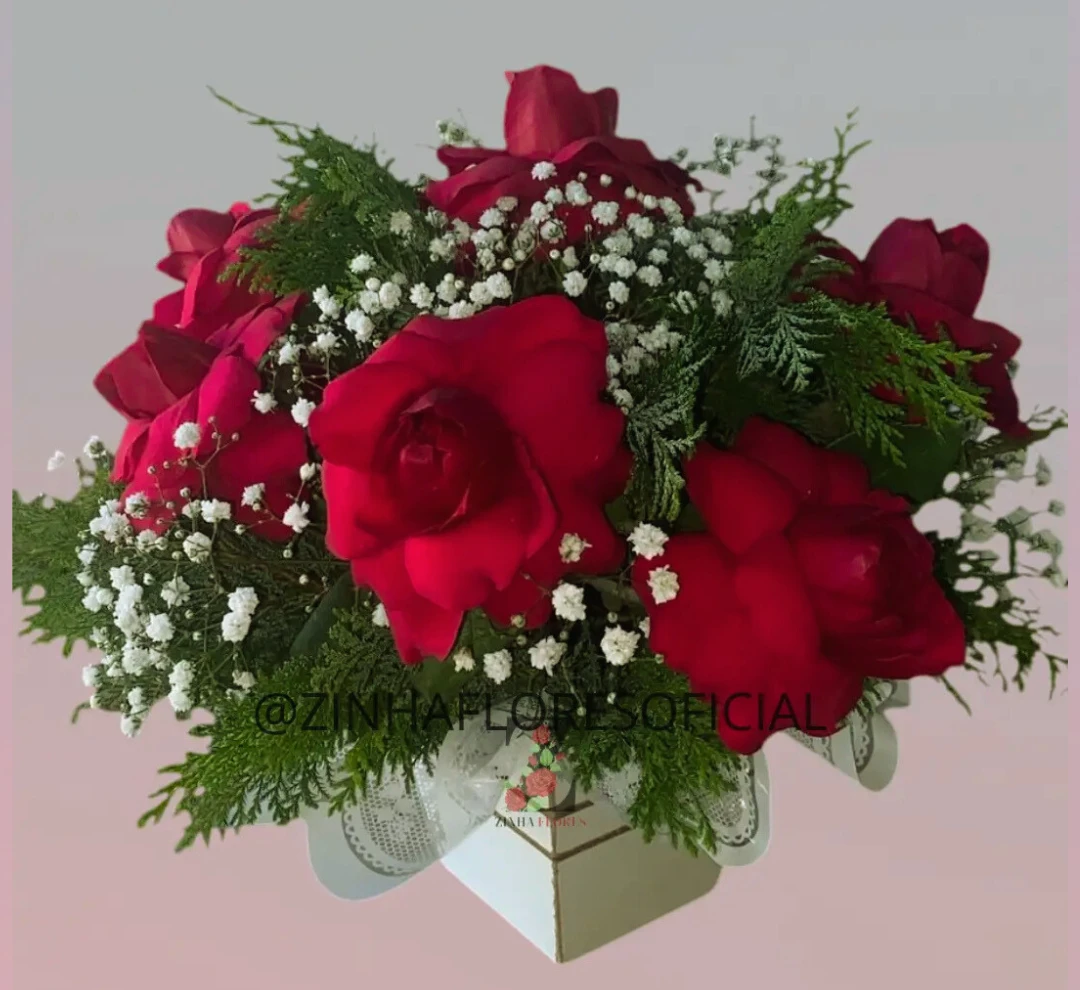 Este presente possui rosas vermelhas, folhagens e gipsofilas, além de ser confeccionado cuidadosamente com uma base e telas decorativas.